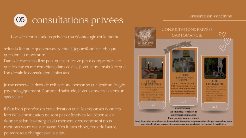 Je suis diplômée en petite enfance et formée à la cartomancie.