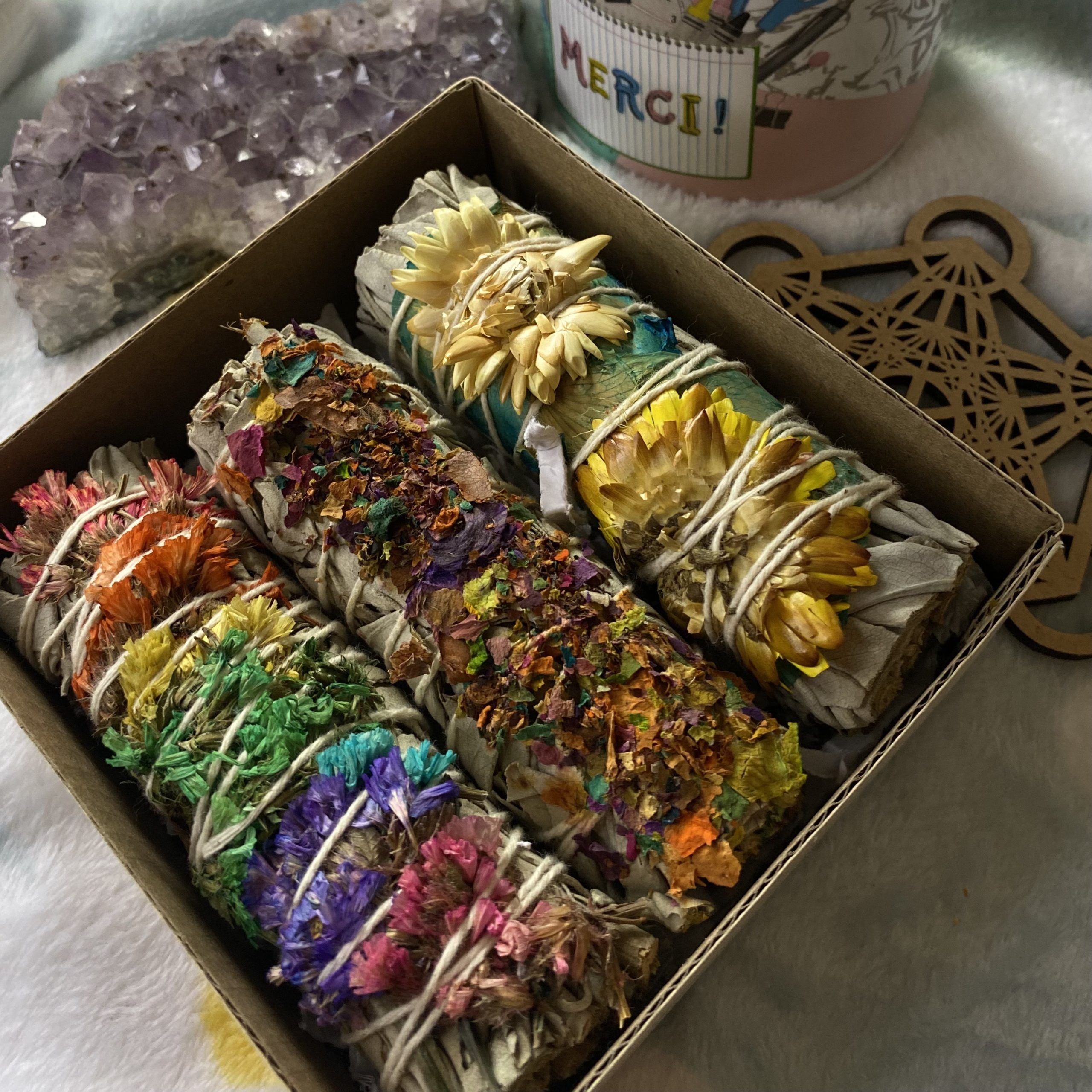 purifiez votre espace avec cette magnifique sauge blanche décorée de pétales de fleurs séchées ( au hasard)
